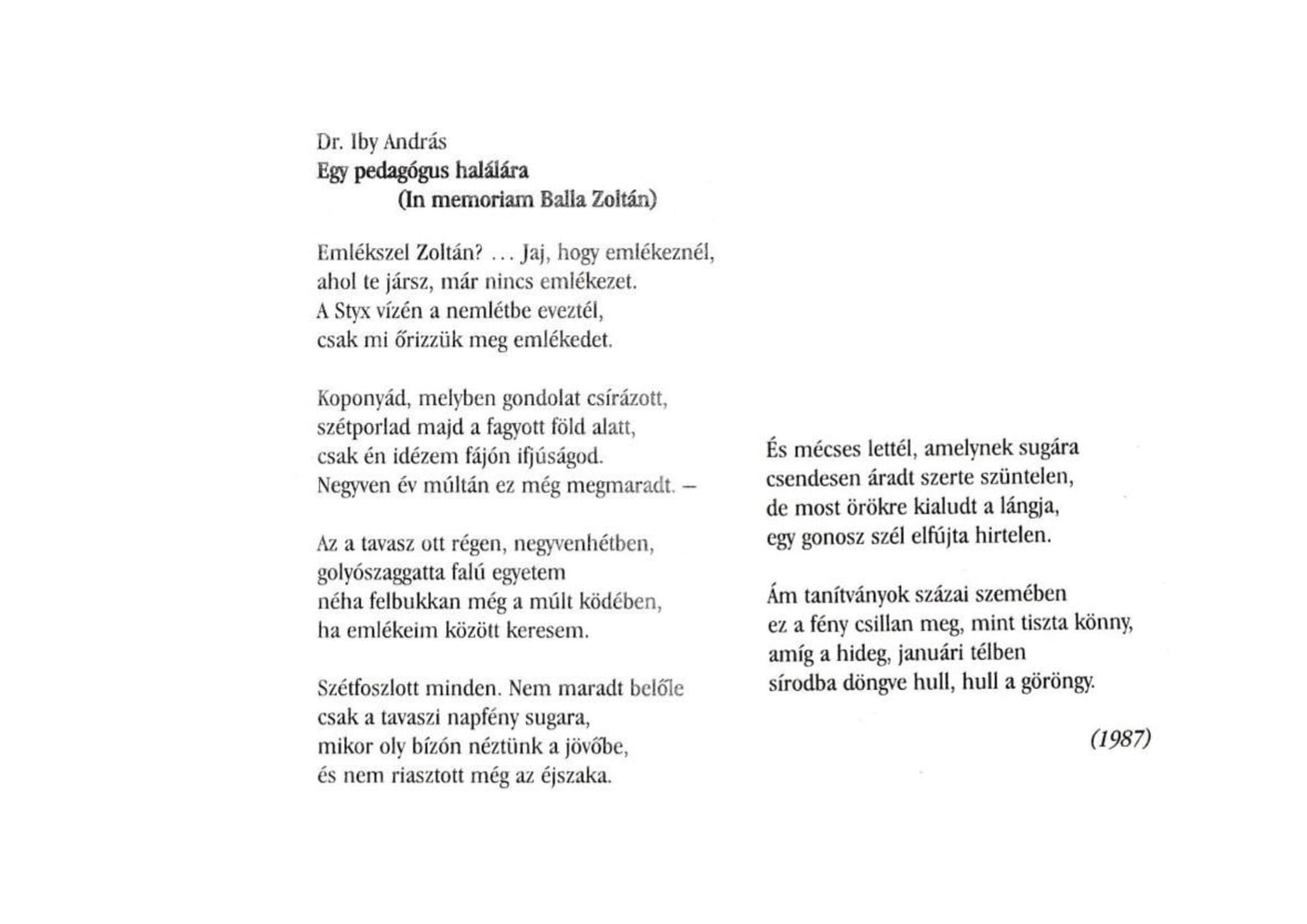 Váratlan halálát követően tanártársa, a vele egyidős Dr. Iby András verssel örökítette meg emlékét.