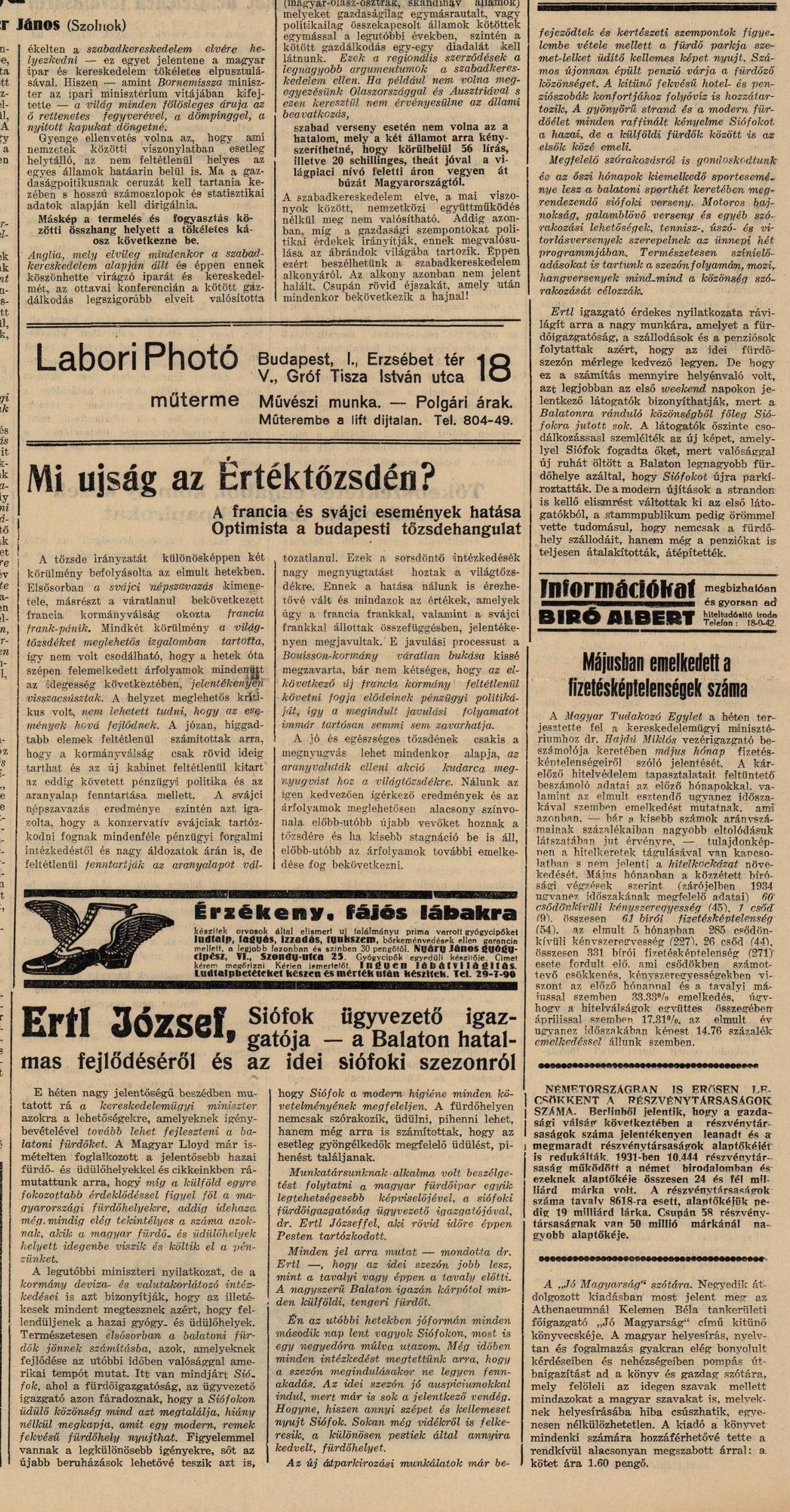 Ertl József a Magyar Lloyd című lap 1935. június 8-i számában nyilatkozott a siófoki szezonról (a cikk a képek között elolvasható)