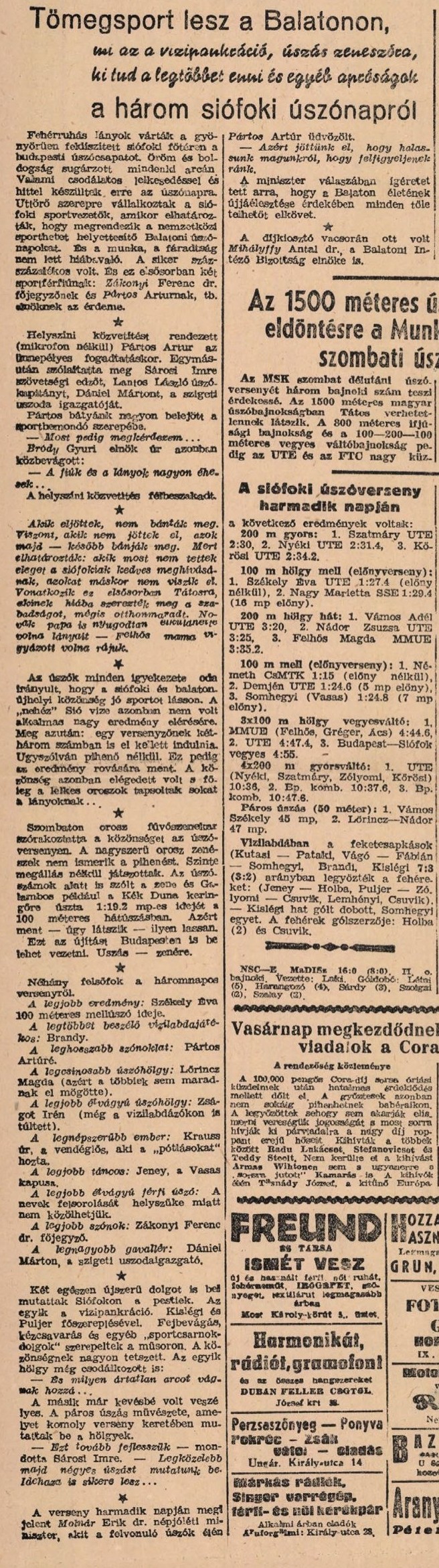 Várszegi János: Tömegsport lesz a Balatonon, mi az a vízipankráció, úszás zeneszóra, ki tud legtöbbet enni és egyéb apróságok a három siófoki úszónapról = Népsport, 1945. szeptember 19.  4. o.