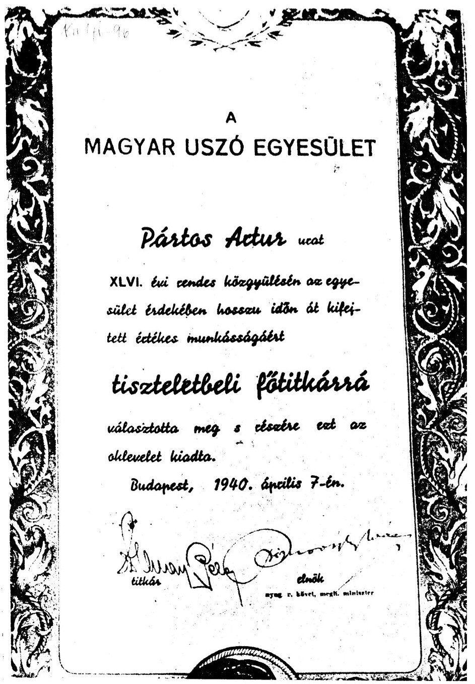 A MUE tiszteletbeli főtitkári oklevele (másolat, Kenedy-hagyaték)