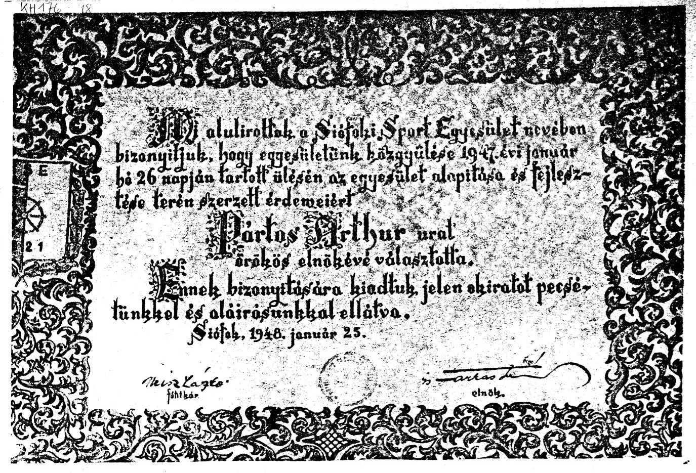 A Siófoki Sport Egyesület örökös elnöki oklevele (másolat, Kenedy-hagyaték)