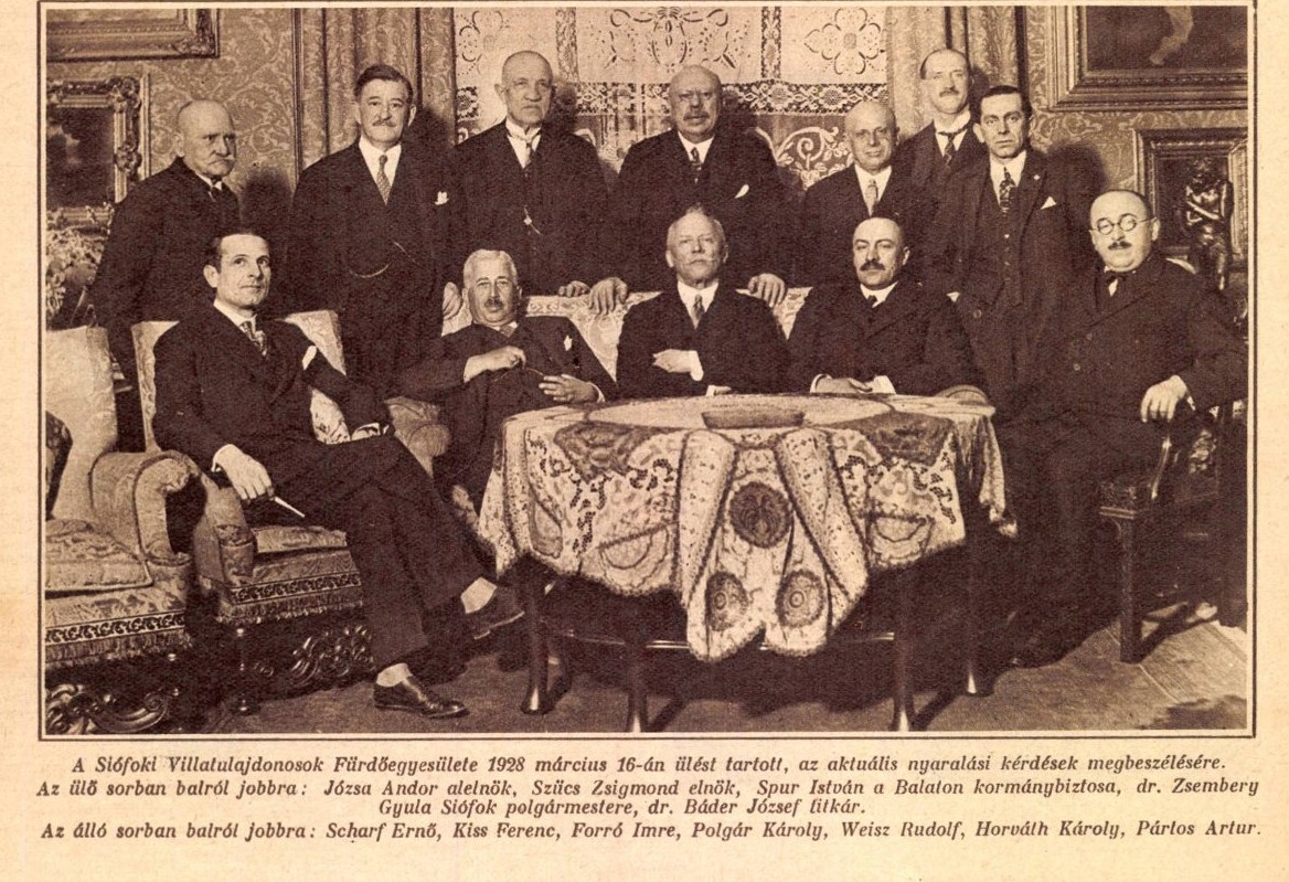 A Siófoki Villatulajdonosok Fürdőegyesülete 1928. március 16-i ülése, az ülő sorban balról jobbra: Józsa Andor alelnök, Szűcs Zsigmond elnök, Spur István a Balaton kormánybiztosa, az álló sorban balról jobbra: Scharf Ernő, Kiss Ferenc, Forró Imre, Polgár Károly, Weisz Rudolf, Horváth Károly, Pártos Artur = Magyarság 1928. március 29. 6. o. (fotó)