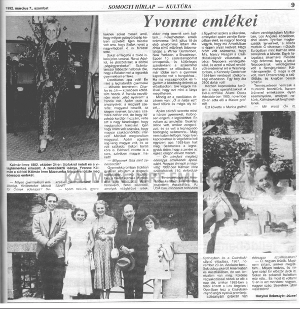 Matyikó Sebestyén József: Yvonne emlékei = Somogyi Hírlap, 1992. március 7., 9.