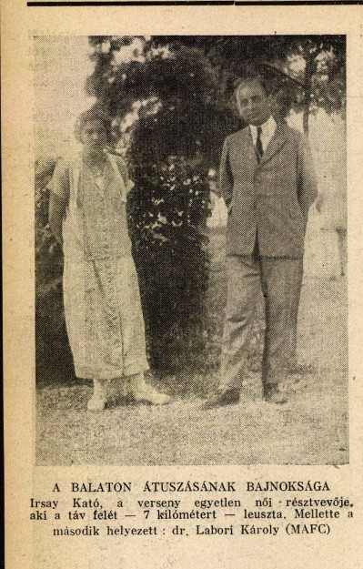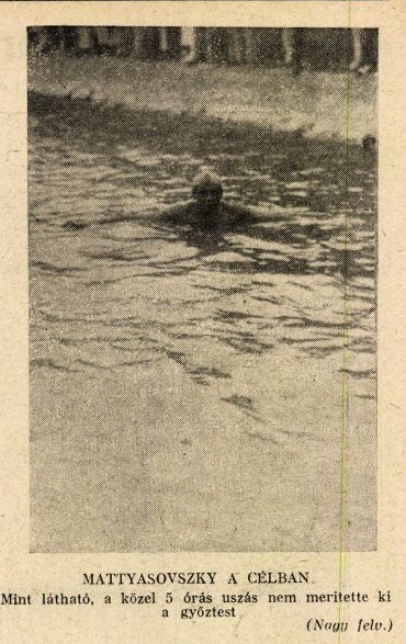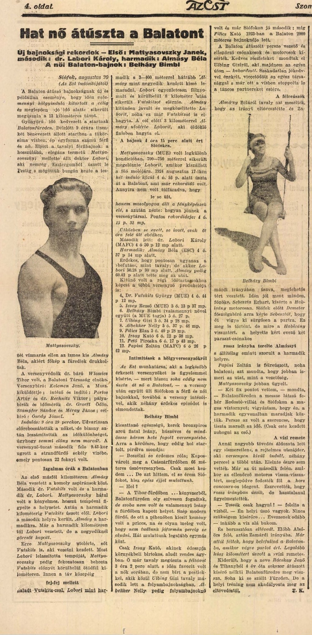 Mattyasovszky (MUE) volt legkülönb kondícióban. 700–750 méterrel sikerült megelőznie Laborit, amikor kiszállott a Sió molójára. 1924. augusztus 17-ikén hét induló közül 4 ó. 53 p. alatt úszta át a Balatont, ami már rekordidő volt. Annyira nem volt túlfáradva, hogy le se ült, hanem mosolyogva állt a fényképészek elé, s azután nézte: hogyan jönnek a versenytársai. Pontos rekordideje: 4 ó. 15 p. 32 mp. Útközben se evett, se ivott, csak öt óra felé ült ebédhez. […]