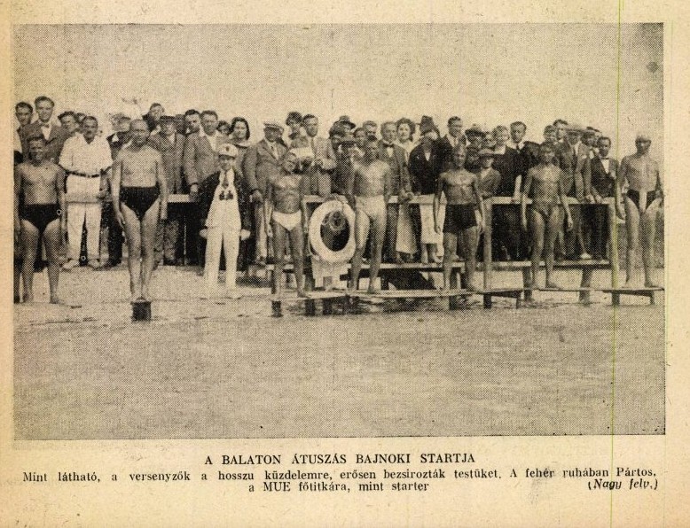 Gyönyörű idő kedvezett a startnak Balatonfüreden. Délelőtt 9 órára tizenkét benevezett állott a tükörsima vízben, ép egyforma számú férfi és nő. Eljött a tavalyi férfibajnok: hosszúlábú, elegáns Mattyasovszky; mellette állt doktor Labori, aki nemrég Esztergomból úszott le Pestig s mögöttük buzgón kente a testét vízmarás ellen az izmos kis Almásy Béla, akiért főkép a fürediek drukkoltak.